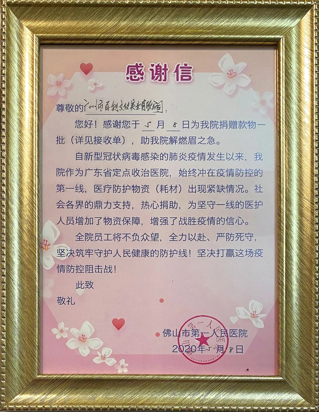 佛山市第一人民醫(yī)院致百利感謝信